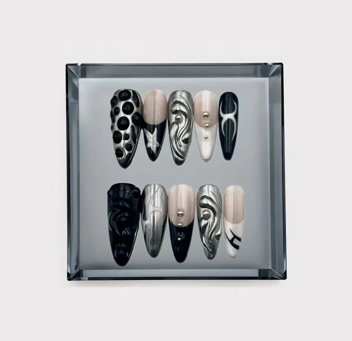 A striking embodiment of the "Cyber-core" and "Avant-Garde" movements, this design is inspired by the futuristic, tech-heavy aesthetics of icons like Grimes. It features unique 3D "crater" textures and hand-painted metallic tribal swirls that mimic liquid silver flowing across the nail. With industrial silver studs and a sleek finish, these nails are built for an edgy, sci-fi vibe that pushes the boundaries of traditional nail art.