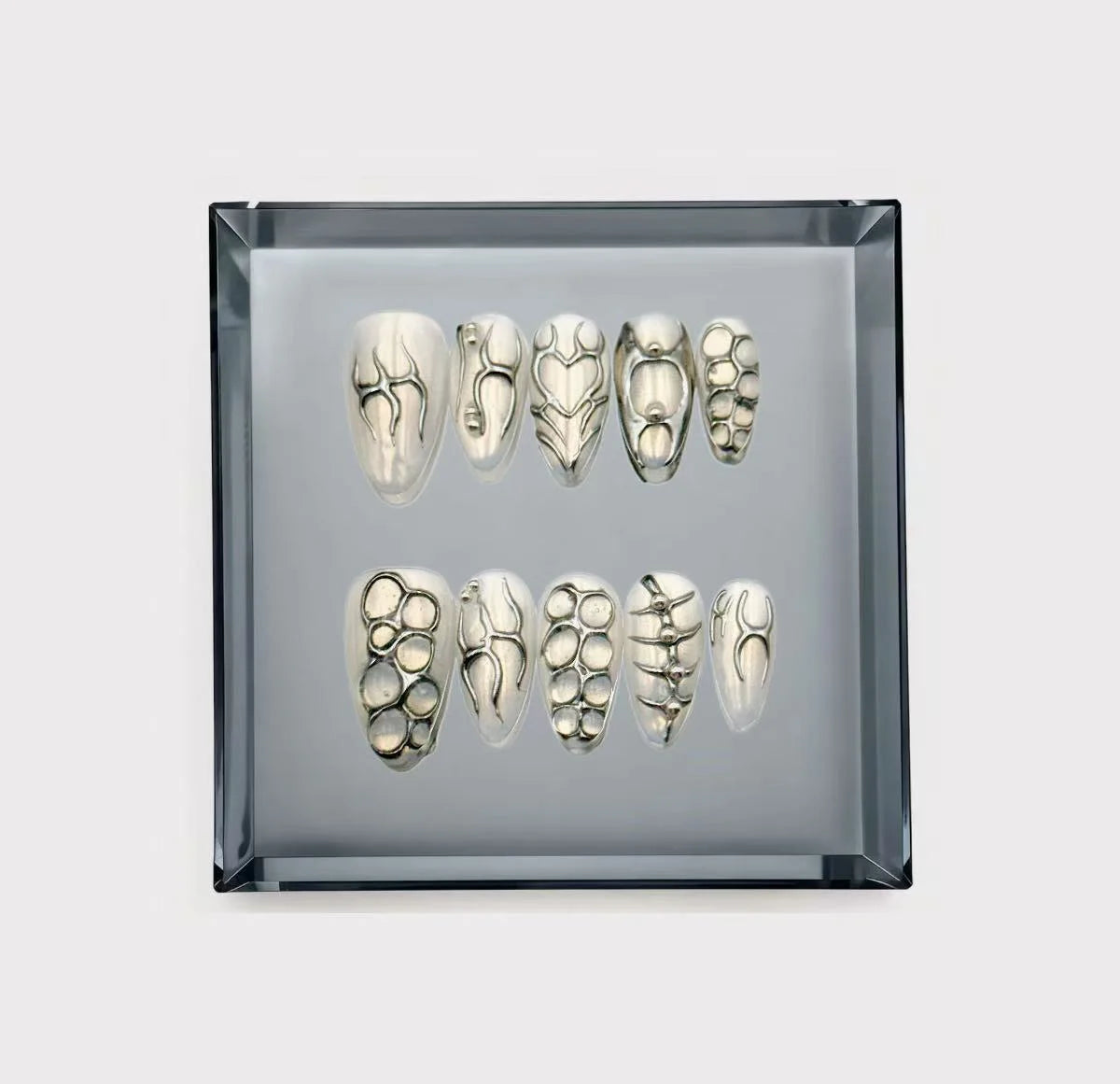 Inspiration: The epitome of "Cyber-core" and futuristic fashion. This set features 3D "liquid metal" textures, abstract tribal swirls, and sharp starburst motifs in a high-shine silver chrome. It’s a high-tech, edgy look that feels like it’s pulled straight from a futuristic sci-fi film.