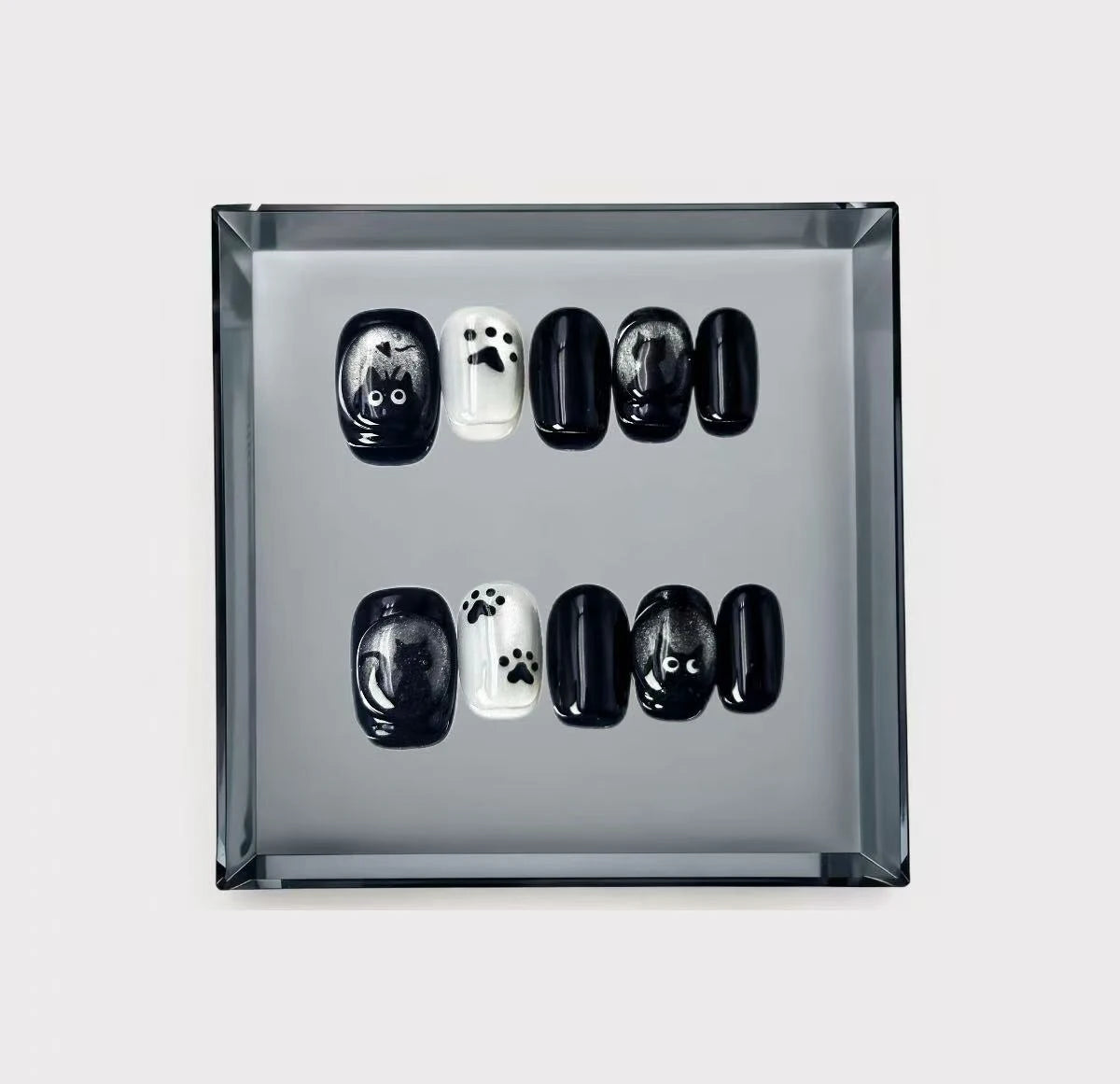 Inspiration: This design draws from a whimsical midnight garden where playful "Kuro Neko" black cats roam under a stardust sky. These handmade cat nails feature 3D cartoon cat motifs, shimmering magnetic cat-eye polish, and delicate paw print accents, channeling the cozy-chic energy of Jiji from Kiki’s Delivery Service or Ghibli’s Soot Sprites. These cat-eye magnetic nails offer a Ghibli-inspired look that is both adorable and avant-garde for any dark academia or kawaii lover.