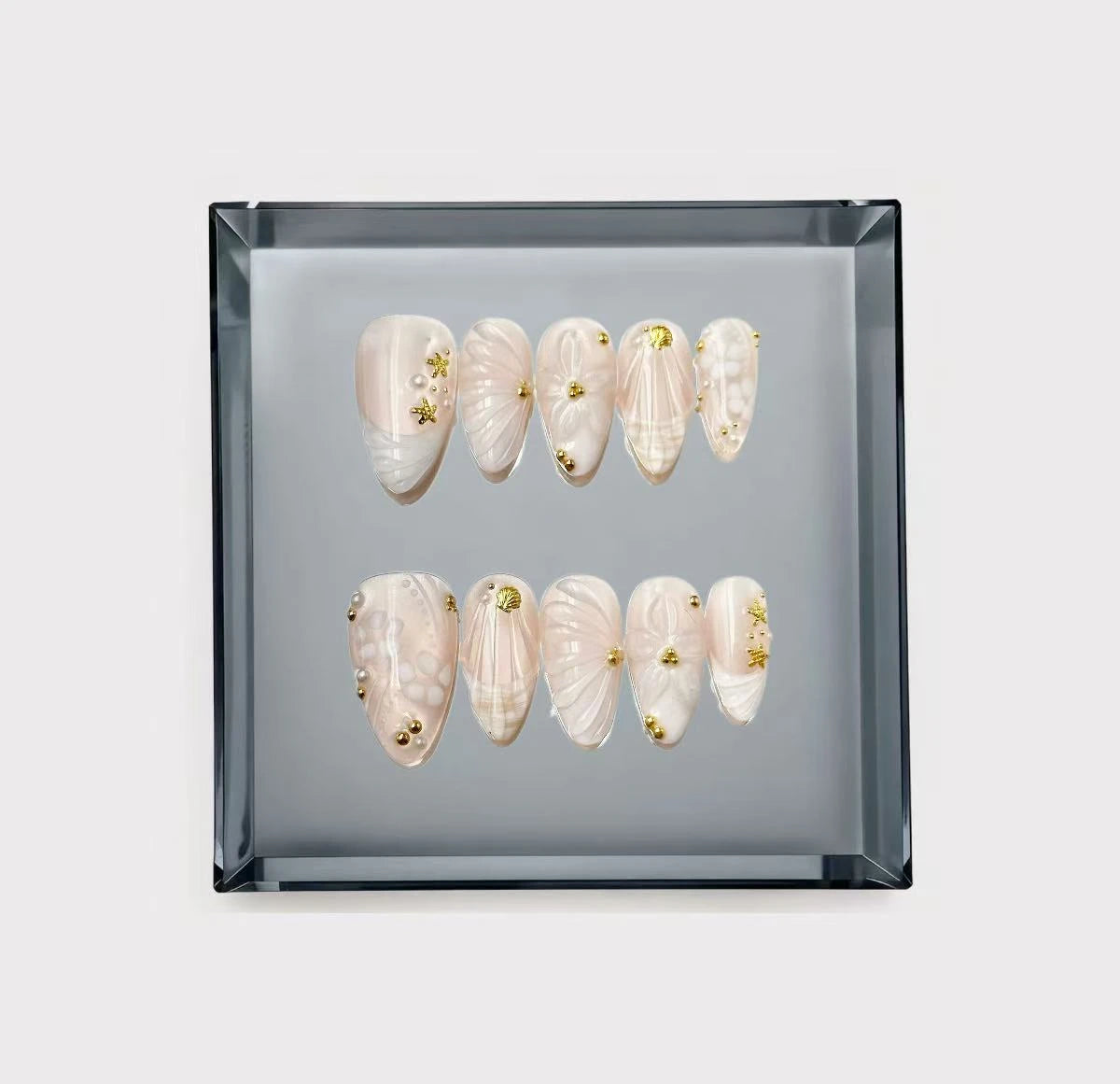 Inspiration: A masterpiece of "Mermaidcore" and "Sirencore," this design replicates the texture of the ocean with 3D seashell ridges, golden starfish charms, and sea-foam white gradients. The iridescent finish and pearl details make it the ultimate vacation set for a coastal-chic look.