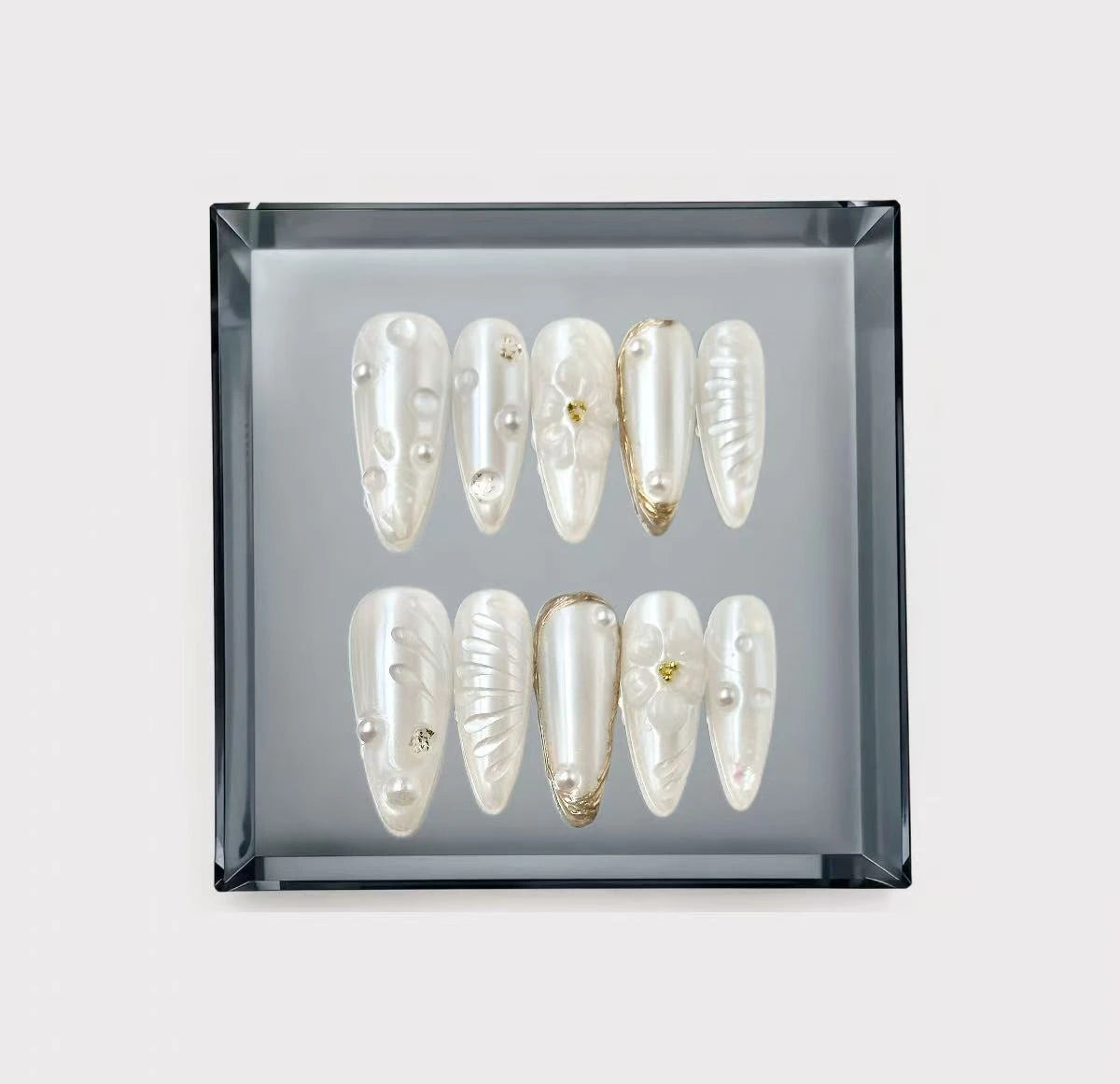 Inspiration: Shine with understated elegance in these pearlescent white nails adorned with scattered crystal rhinestones. A clean and radiant choice that provides a sophisticated glow perfect for special celebrations.