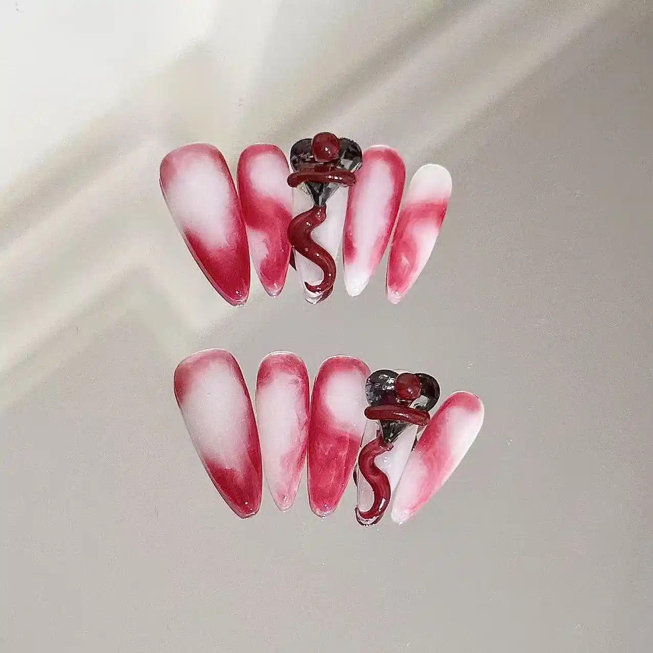 A bold red and white gradient stiletto nail set with striking 3D snake and heart details. Ideal for those who love edgy, gothic, or dark feminine aesthetics.