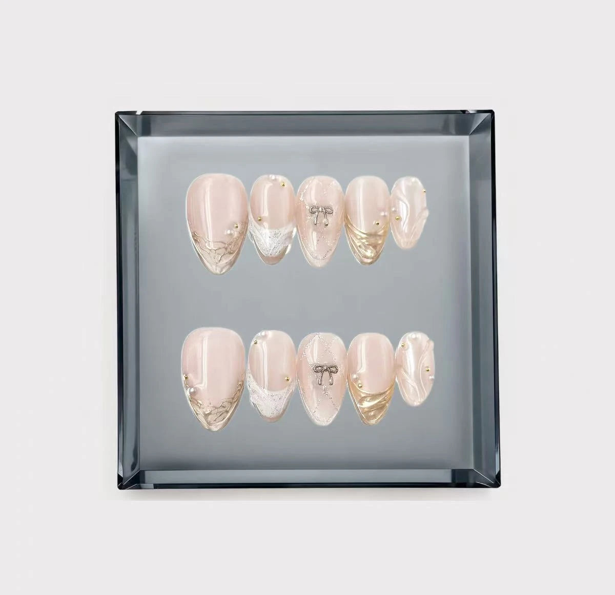 Inspiration: Deeply rooted in the "Ballet core" and "Coquette" trends. This intricate set combines 3D silver bows, delicate pearls, and textured white lace art. It evokes the romantic feel of a Victorian love letter, making it a stunning choice for special occasions or tea parties.